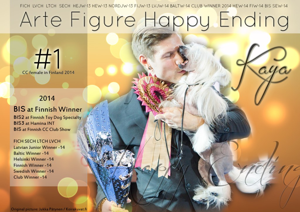 What a great year 2014 we had! FICH LVCH LTCH SECH HEJW-13 HEW-13 NORDJW-13 FIJW-13 LVJW-14 BALTW-14 CLUB WINNER 2014 HEW-14 FIW-14 SEW-14 Arte Figure Happy Ending “Kaya” CHINESE CRESTED FEMALE #1 in Finland 2014!!!